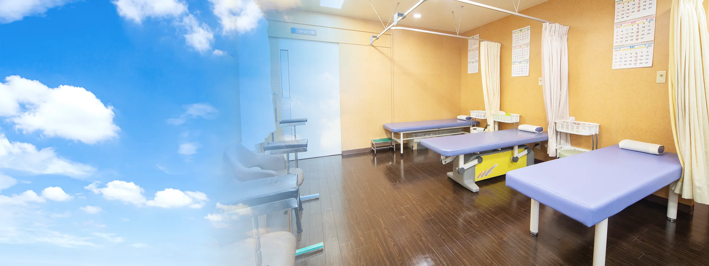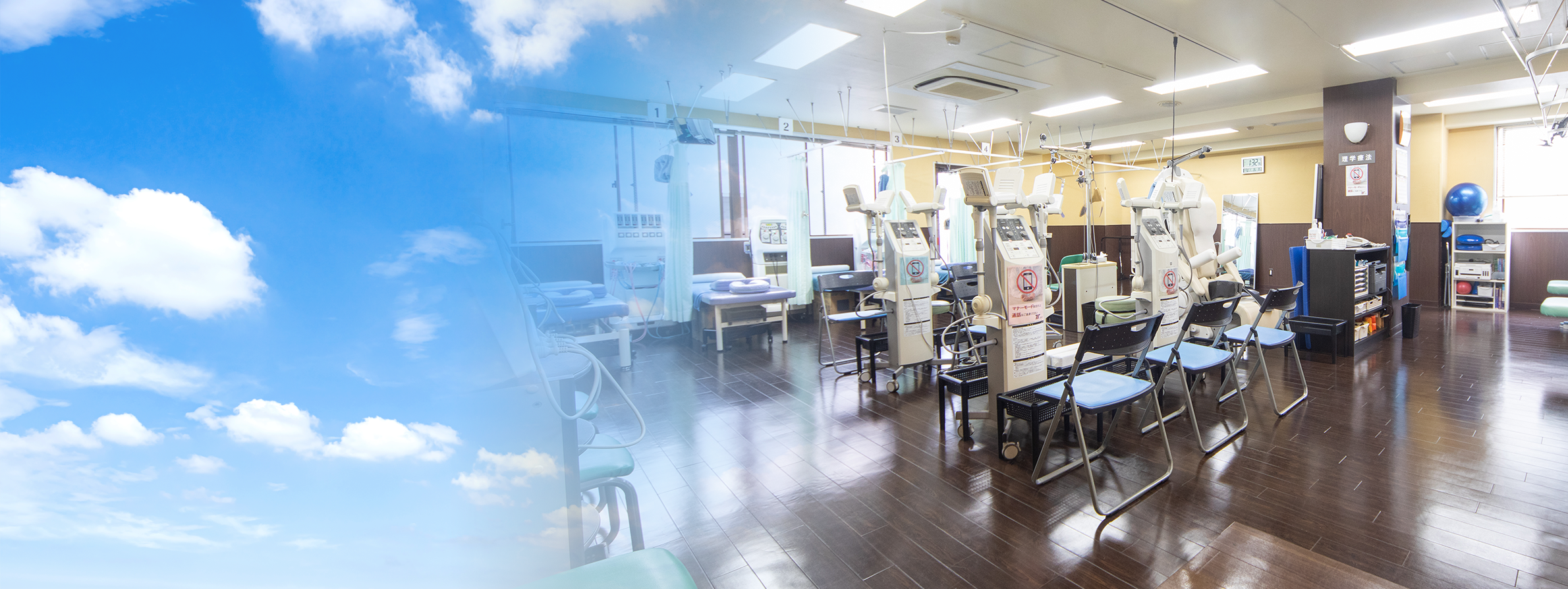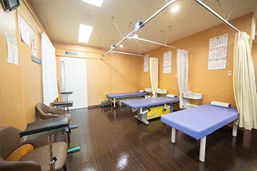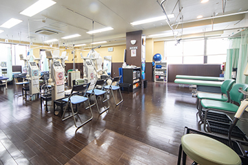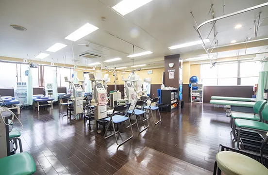 リハビリ室には、多種のリハビリ機器が設置されており、資格を持ったスタッフががリハビリを行っています。 また、理学療法士による運動器リハビリテーションも行っており、運動器リハビリテーション(Ⅰ)の施設基準を満たしています。
