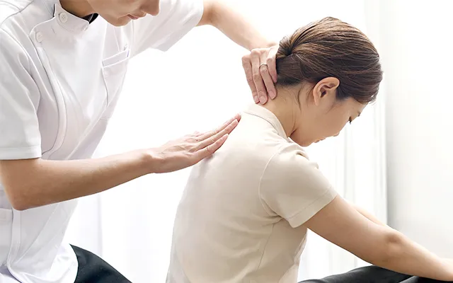 肩関節周囲炎(四十肩,五十肩)などで腕が上がらない,痛みを生じるという症状の方に対し,まずは硬くなった肩関節や肩甲骨をマッサージなどでほぐしながら症状の改善を図ります。徐々に患者さん自身で肩の運動を行っていただき,筋力をつけて筋肉のバランスを整え,動作の向上を目指していきます。